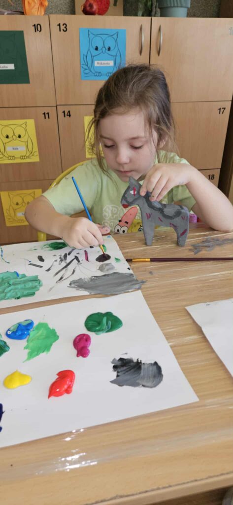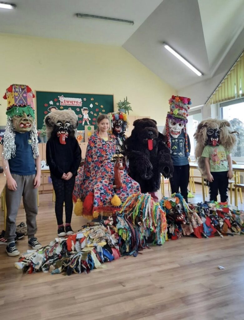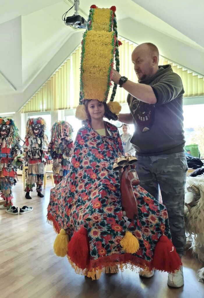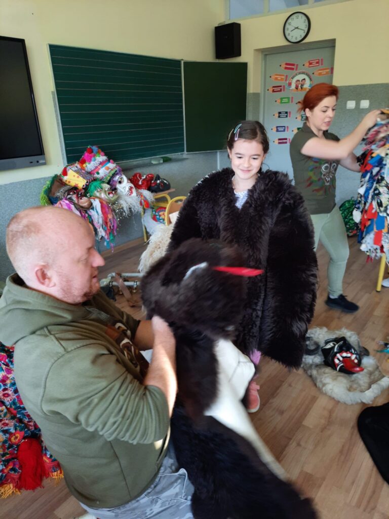 Był czas na opowieść o dziadach, przymierzanie strojów, warsztaty plastyczne i trening „gonienia z dziadami”. Każdy uczeń dostał nawet swojego drewnianego konika, którego mógł ozdobić, bo pan Bartek jest również ludowym rzeźbiarzem.