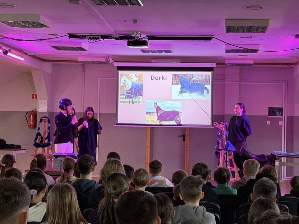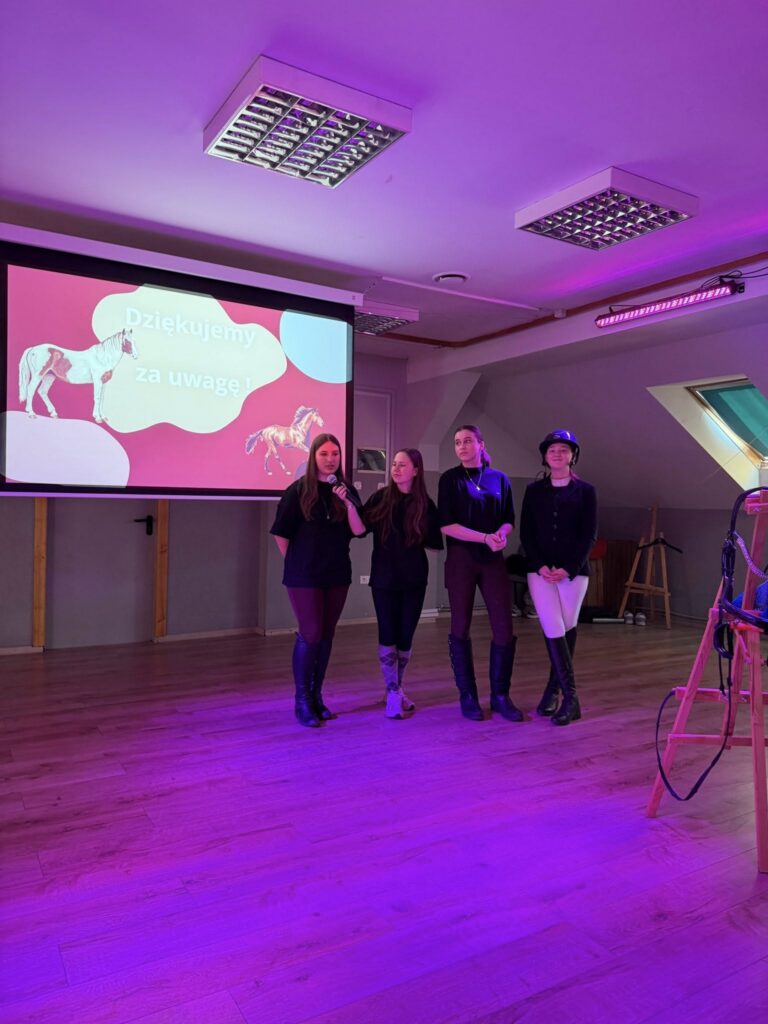 Uczennice klasy siódmej: Julia, Julia, Maja i Zuzanna przygotowały prezentację o jeździe konnej.