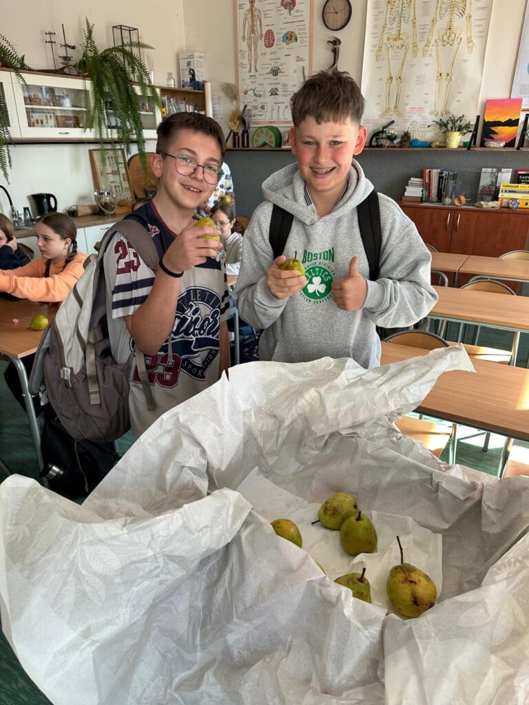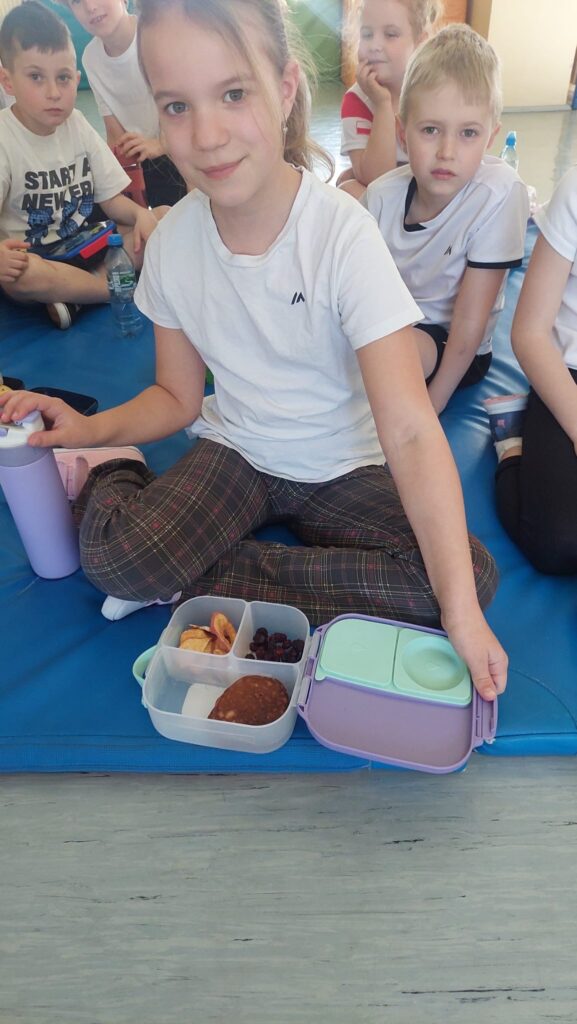 19. 03.2026 to kolejny dzień Tygodnia Zdrowia. Tym razem rozmawiamy o zdrowym jedzeniu w kontekście drugiego śniadania. Dzieci klas 1-3 pięknie przygotowały swoje śniadaniówki, a klasa 6a razem ze swoją wychowawczynią – Magdaleną Aftyką częstowała wszystkich zdrowymi gruszkami Lukasówkami.